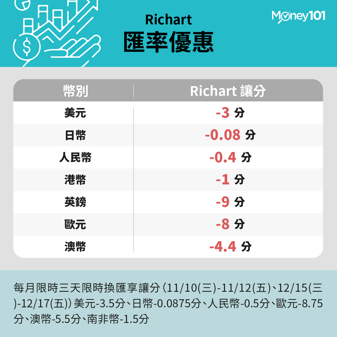 投資想賺錢,除了挑選好的標的外,成本也是決定成敗的關鍵。投資美股以及美元計價的基金,能在美元相對低檔的時候換,自然是降低成本的關鍵之一,但匯率隨時都在變動,怎麼樣才能換到自己心目中的最佳匯率呢?其實很簡單,Richart數位帳戶有「到價通知」的功能,設定你想要的買賣外幣到價通知,當匯率觸及到設定的價格,Richart 會立即通知你,若綁定Richart LINE官方帳號,還可開啟近 7 天及 30 天最低價通知唷!
